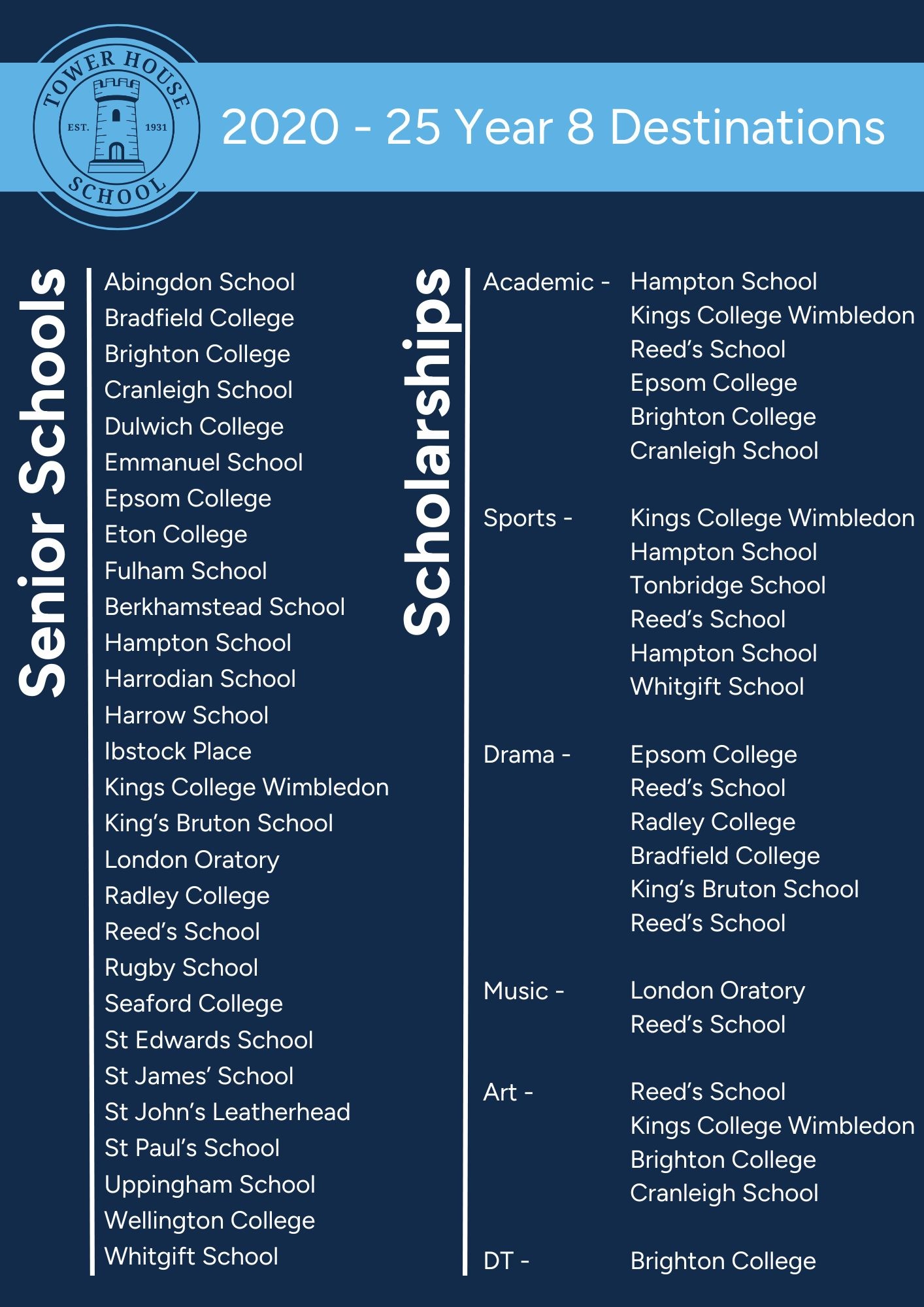 Tower House boys complete their Common Entrance exams in the summer of Year 8. We are incredibly proud of each and every one of them as they move onto a wide range of outstanding schools.